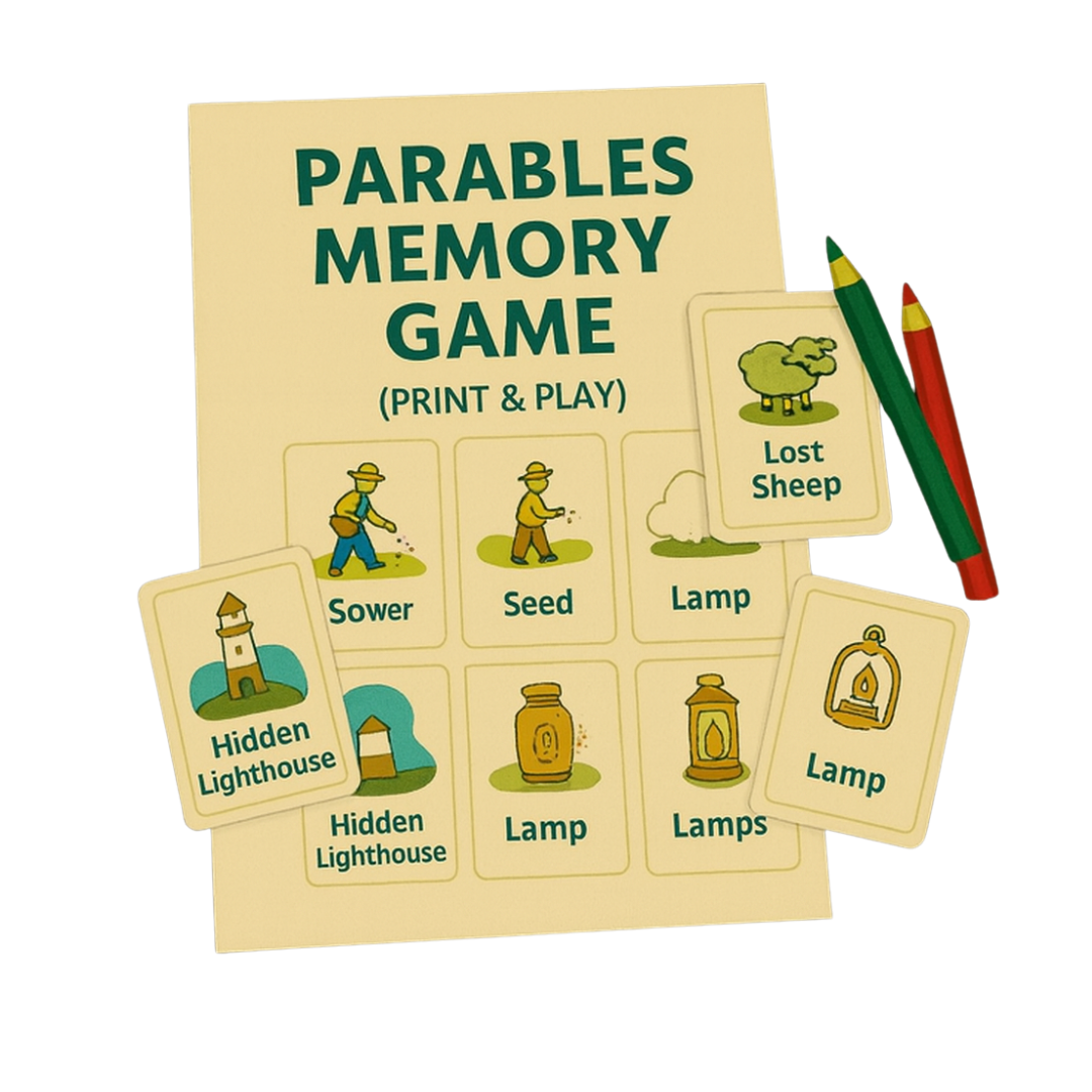 Colorful cards with names and symbols of the parables to cut out, play and memorize the biblical content with joy.
